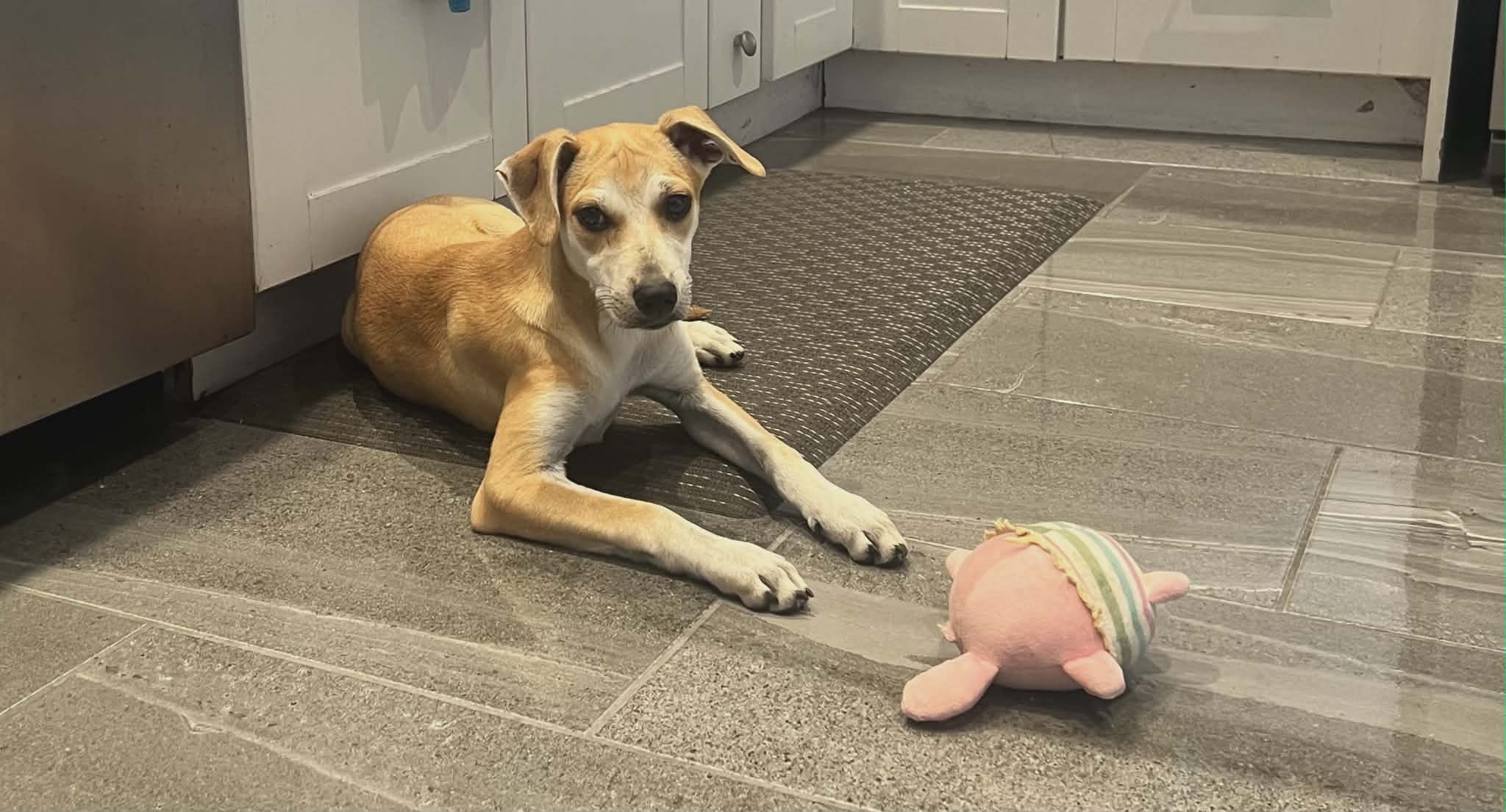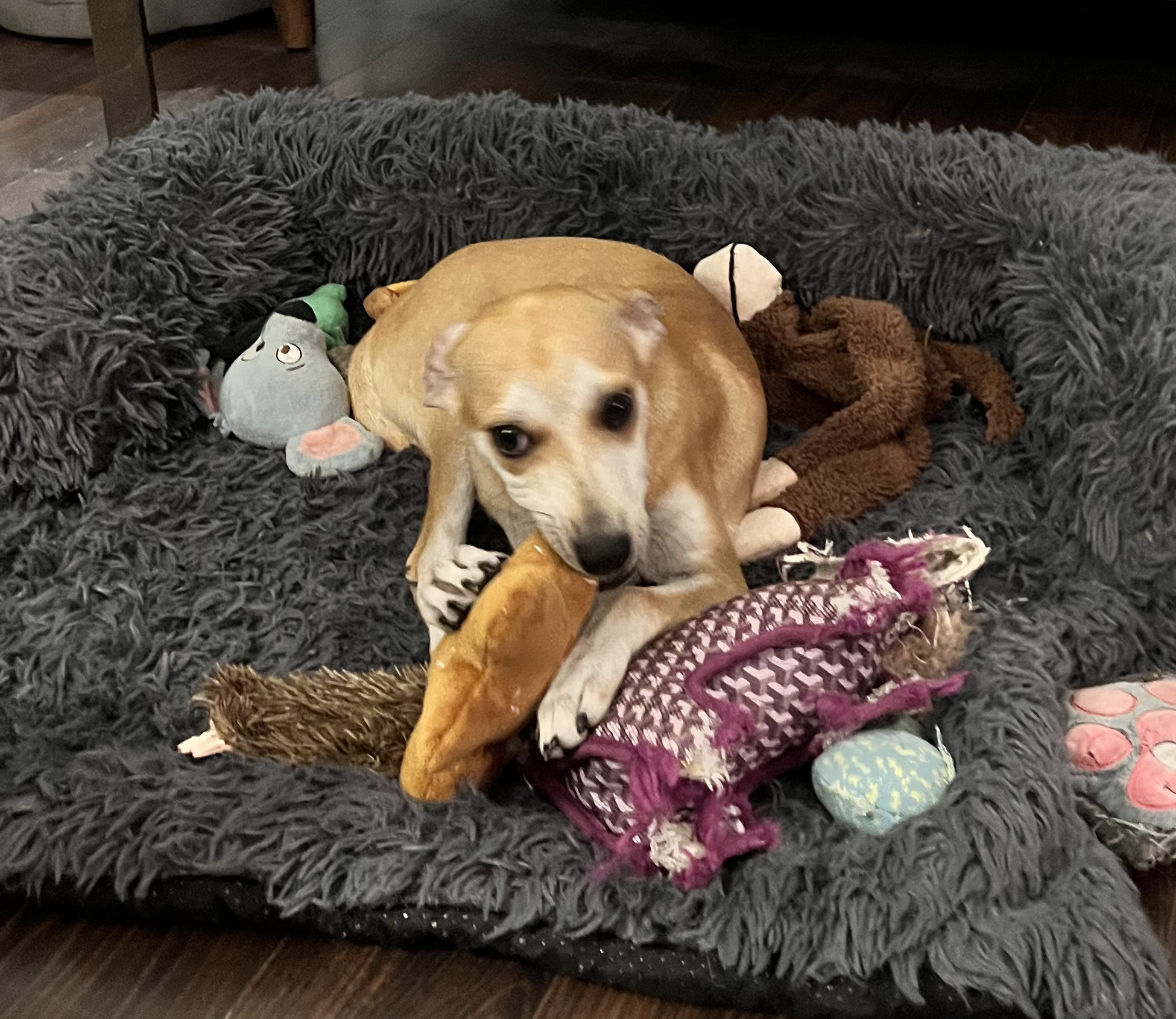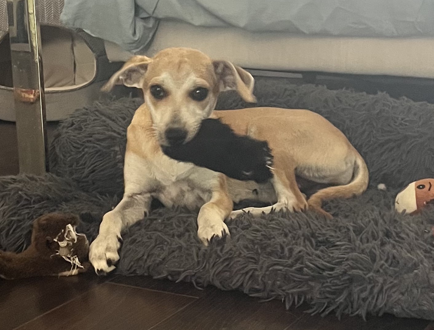 She has plenty of toys and loves playing with them, and she’s not destructive at all—no worries about leaving shoes out or her chewing on furniture. When it’s time to relax, she’s happiest cuddled up beside you while you watch TV or snuggled in close at bedtime.